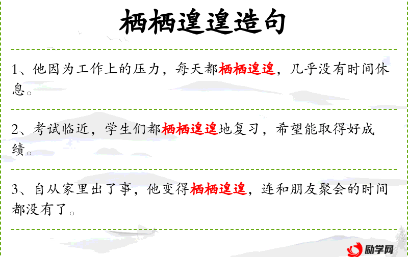 4. 【栖栖遑遑】 - 栖栖:不安定的样子;遑遑:匆忙不安的样子。形容忙碌、仓促、身心不安。