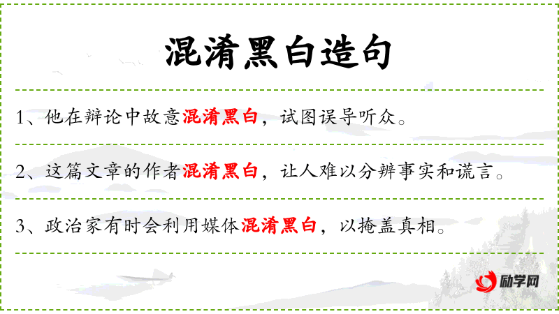 混淆:使界限模糊。故意把黑的说成白的,白的说成黑的,制造混乱。指故意制造混乱,使人辨别不清。