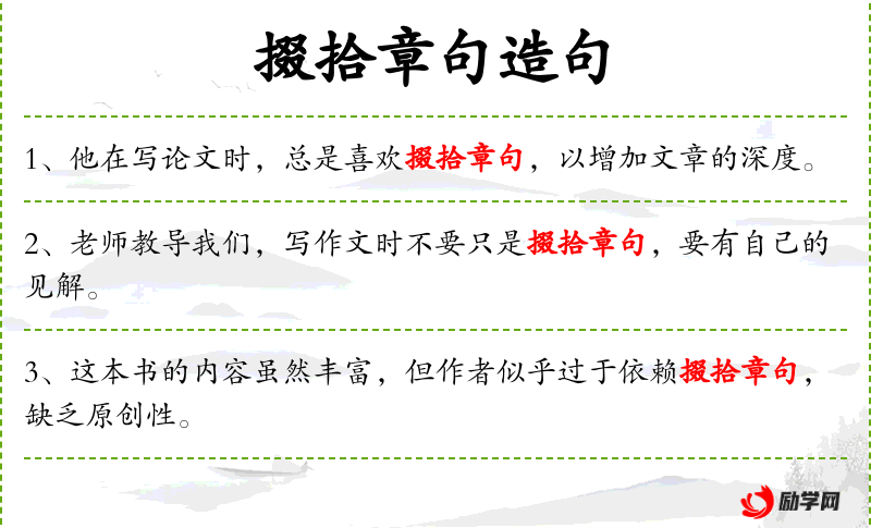 3. 【掇拾章句】 掇:拾取。摘取别人文章的句子。指东摘西抄地拼凑文章。