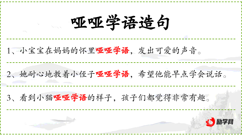 - 哑哑学语:形容词短语,形容小猫模仿人类说话的样子,通常用于比喻。