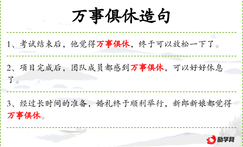 “万事俱休”这个成语源自**传统文化,意味着所有事情都已圆满结束。在现代社会,这个成语常用于形容工作或任务的彻底完成,特别是在团队合作或项目管理中。