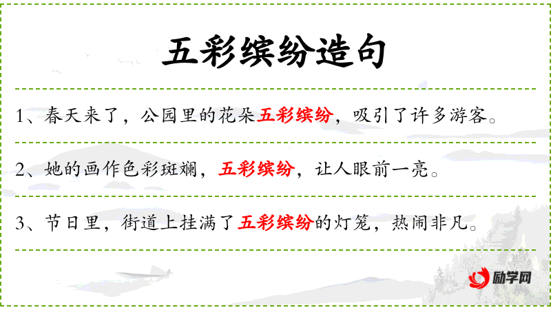 - 五彩缤纷:形容词短语,形容颜色丰富、多样。