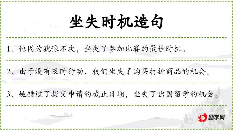 - 坐失:动词,表示因未能及时行动而失去机会。