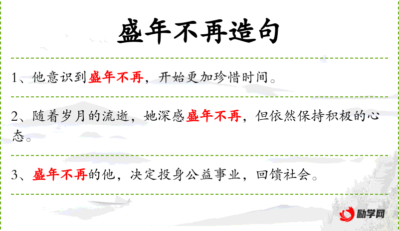 3. 【盛年不再】 - 盛年:壮年;不再:一去不再来。指要珍惜壮年的大好时光。