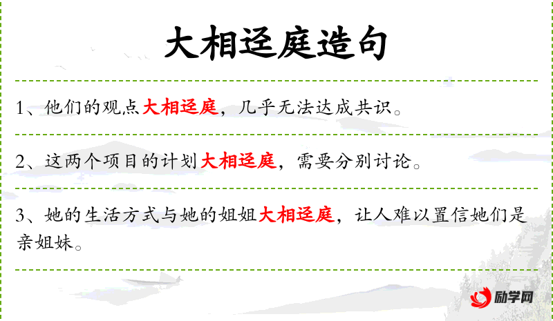 - 大相迳庭:意思是非常不同,差异很大。