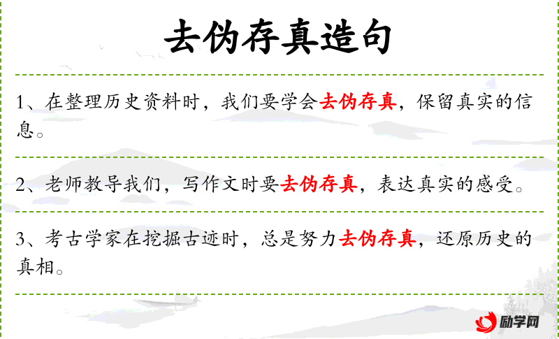 句子中提到的“去伪存真”是一个成语,源自**传统文化,强调在处理信息或知识时,要辨别真假,保留真实。这与历史学家的工作密切相关,因为他们需要从众多资料中筛选出真实可靠的信息。