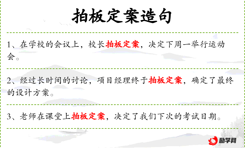 - 拍板定案:决定并确定某事,通常指在会议或讨论中做出最终决定。