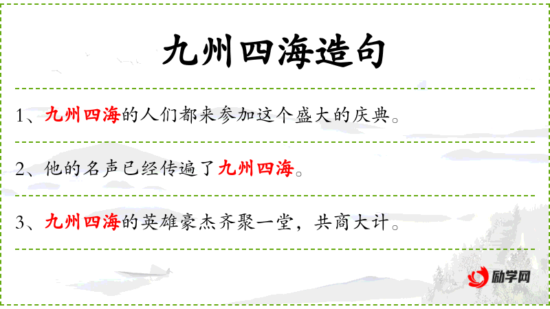 - 九州四海:指全国各地,泛指范围广泛的地方。