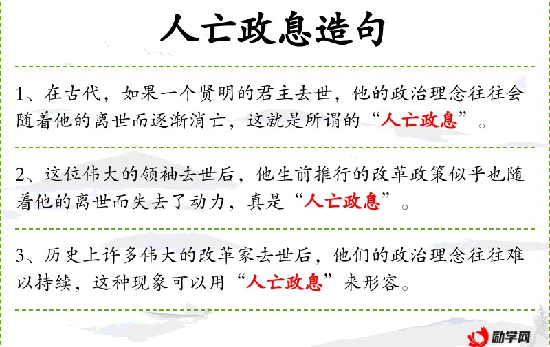 - 人亡政息:成语,意思是当领导人去世后,他所推行的政策也随之停止或失去效力。