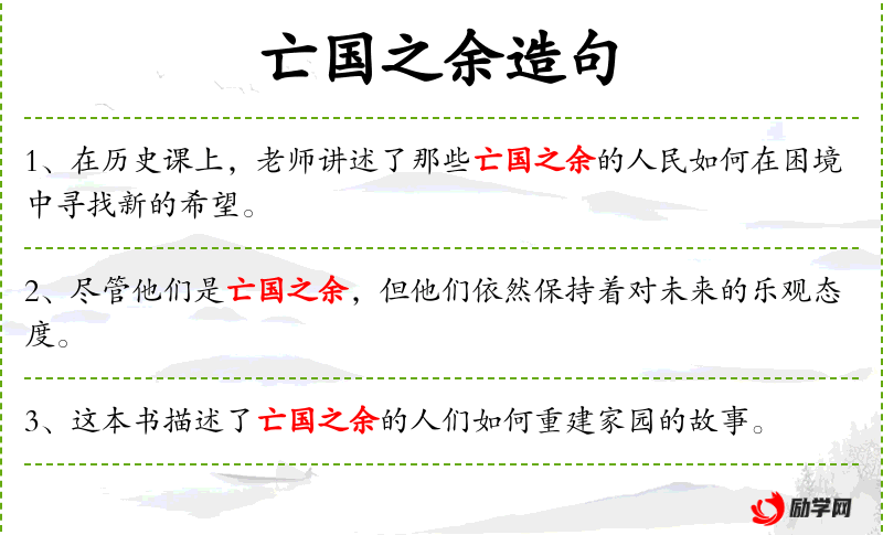 - 亡国之余:在历史上,亡国之余常指被外族征服后的人民,这种表达蕴含了对民族精神的赞扬和对历史苦难的回顾。
