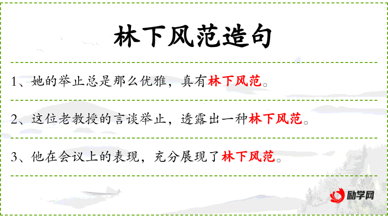 3. 【林下风范】 - 林下:幽僻之境;风范:风度。指女子态度娴雅、举止大方。