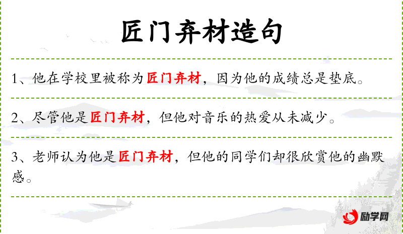 句子:“匠门弃材的他,通过不懈努力,最终在数学竞赛中获奖。”