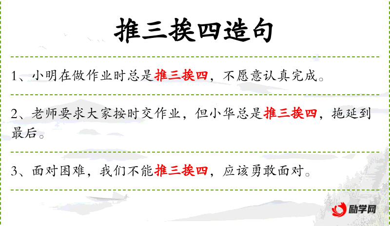 - 我们应该勇敢地面对困难,而不是推三挨四。