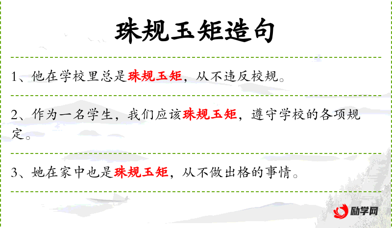 3. 【珠规玉矩】 - 比喻人的言行纯正合乎规矩。