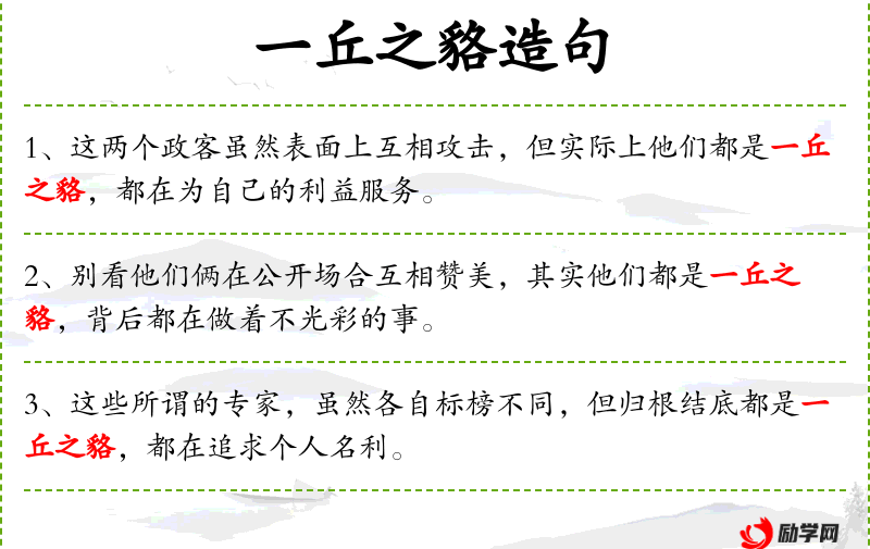1. 【一丘之貉】 - 丘:土山;貉:一种形似狐狸的野兽。一个土山里的貉。比喻彼此同是丑类,没有什么差别。
