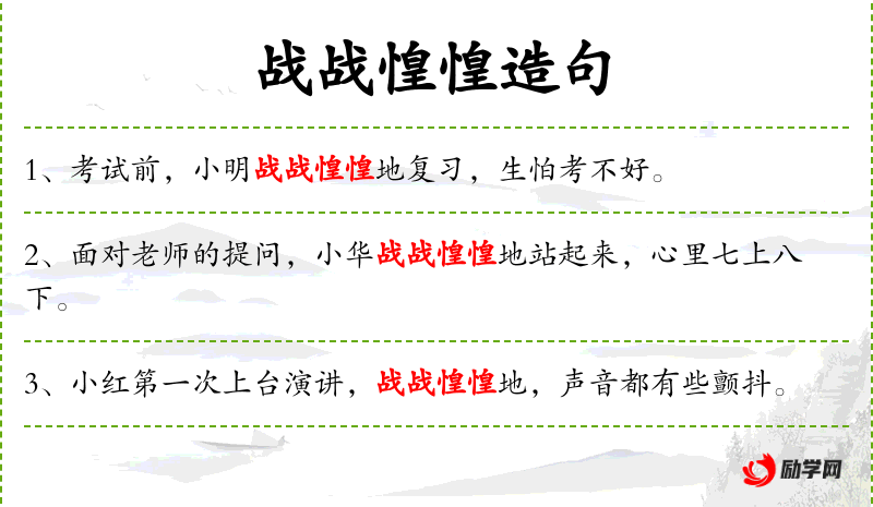 - 战战惶惶地:副词短语,形容非常紧张和不安的状态。