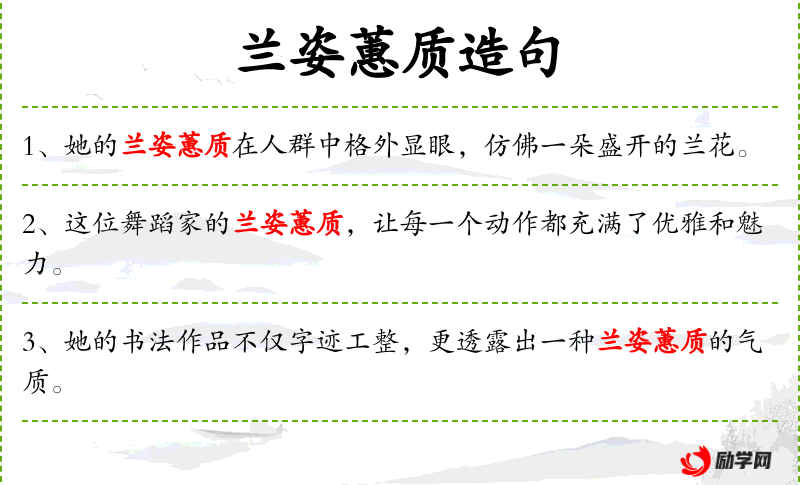 - 同义词:“兰姿蕙质”可替换为“高雅气质”、“纯洁美丽”等。