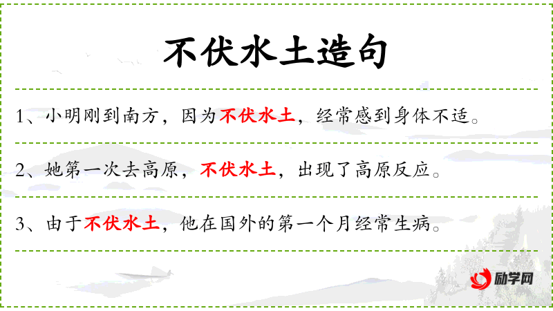 1. 【不伏水土】 - 不能适应移居地方的气候和饮食习惯。同“不服水土”。