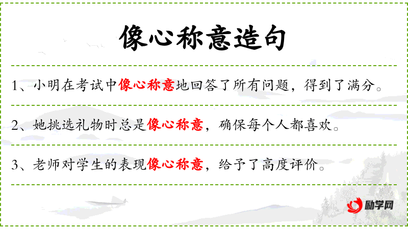 - 像心称意地:形容词短语,表示非常满意或得心应手。