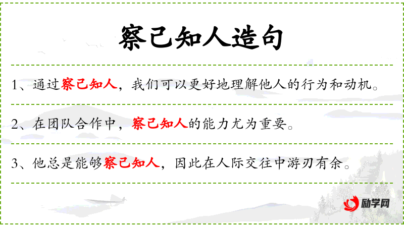 句子:“[老师教导我们要学会察己知人,这样才能更好地与同学相处。]”
