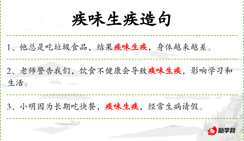 7. 【疾味生疾】 疾味:能导致疾病的食物。吃了能导致疾病的食物必然得病。比喻恶有恶报。