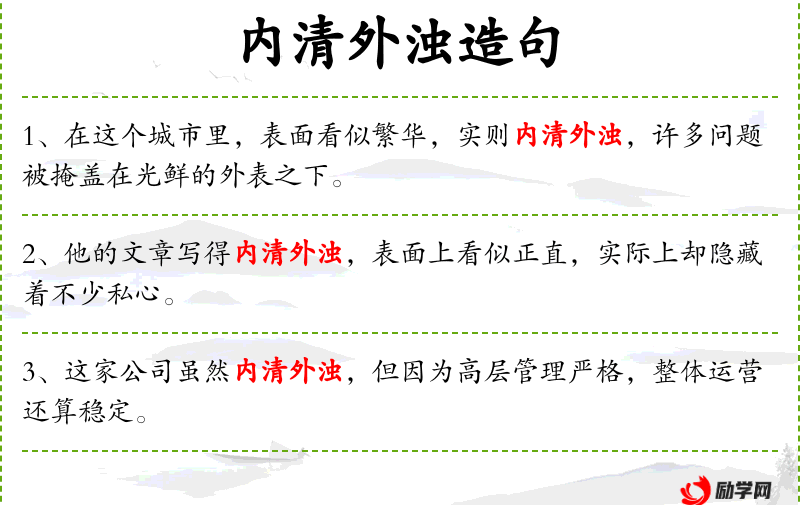 - 内清外浊:形容文章内部内容清晰,外部表现却显得混浊。