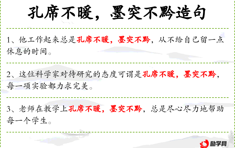 - 孔席不暖,墨突不黔:这两个成语都源自**古代,形容非常忙碌,没有时间休息。在现代汉语中,这两个成语常用来形容人的勤奋和不懈努力。