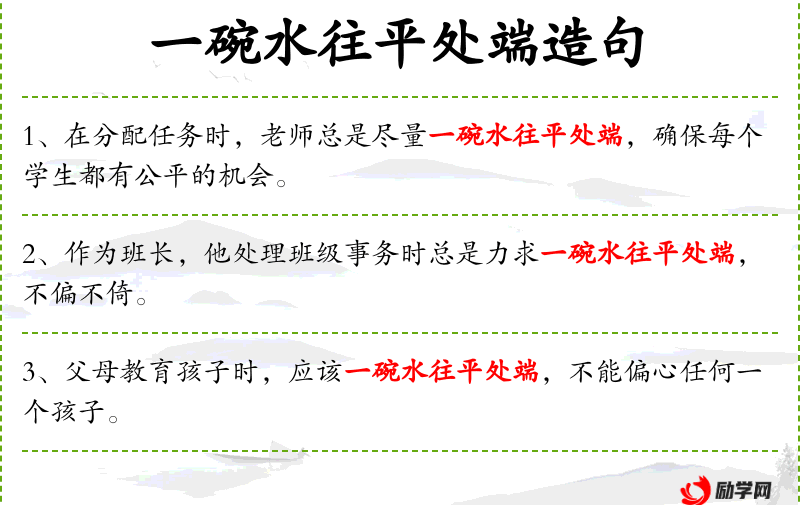 1. 【一碗水往平处端】 - 比喻办事公正不偏袒。