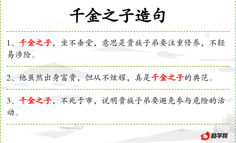 - 不同句式:“尽管他出身富贵,但他从不炫耀,确实是千金之子的典范。”