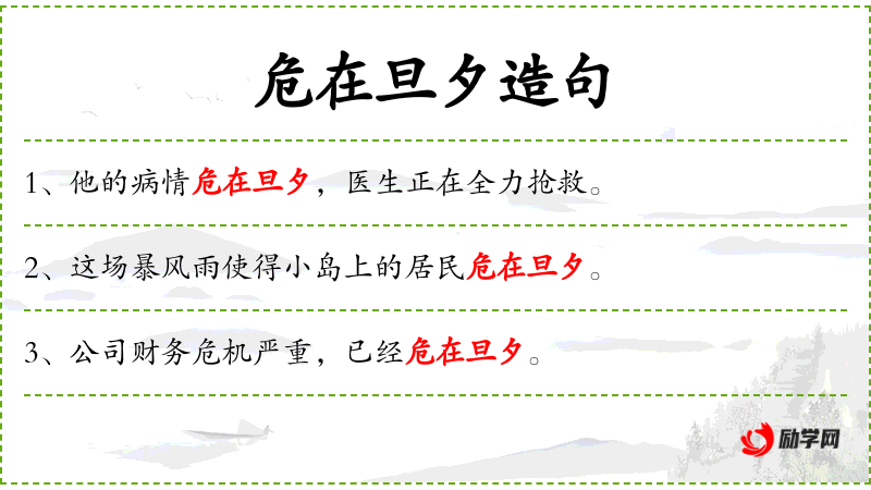 - 危在旦夕:形容危险即将发生,情况十分紧急。