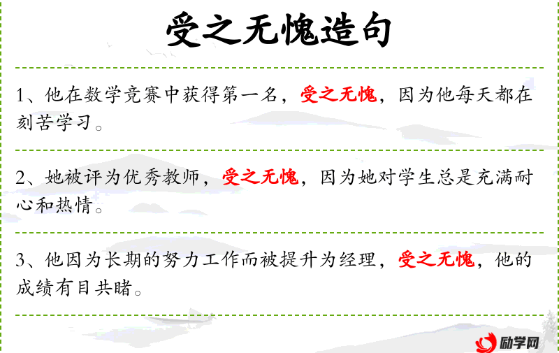 - 受之无愧:成语,表示某人得到某物或某项荣誉是理所应当的。