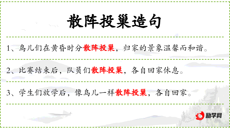 - 散阵投巢:比喻学生们的动作,散开并回家。