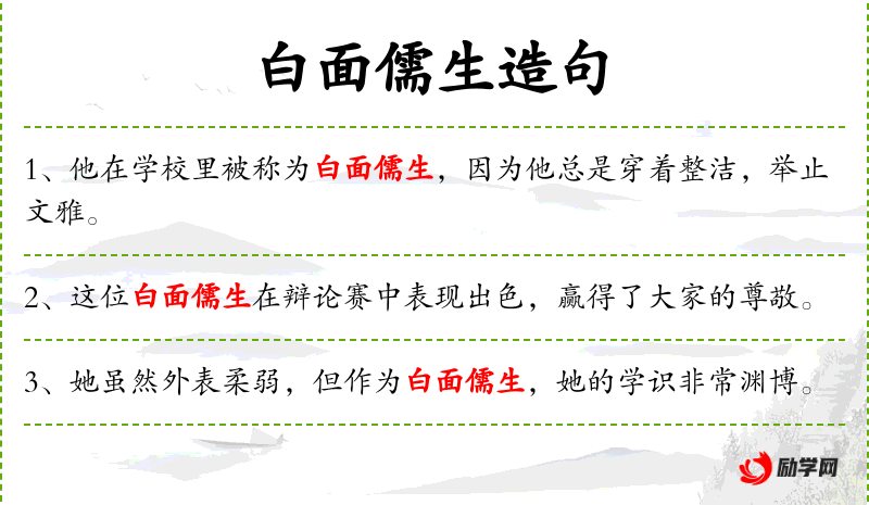 3. 【白面儒生】 - 犹白面书生。指只知读书,阅历少,见识浅的读书人。有时含贬义。亦泛指读书人。