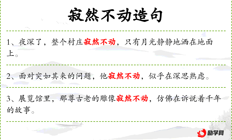 - 寂然不动:形容非常安静,没有任何动静。