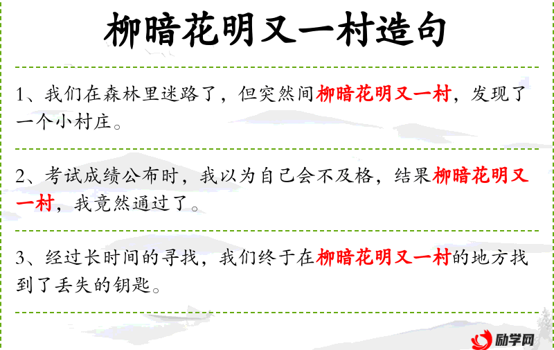 1. 【柳暗花明又一村】 - 原形容前村的美好春光,后借喻突然出现新的好形势。