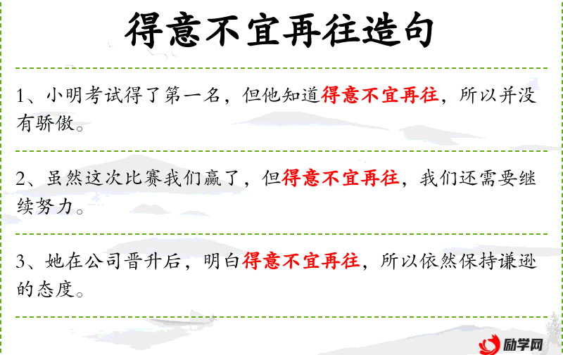“得意不宜再往”是一个**成语,源自《左传·宣公十五年》:“得意不宜再往,再往必败。”这句话强调了在成功后不应过于自满,而应继续保持谦逊和努力。