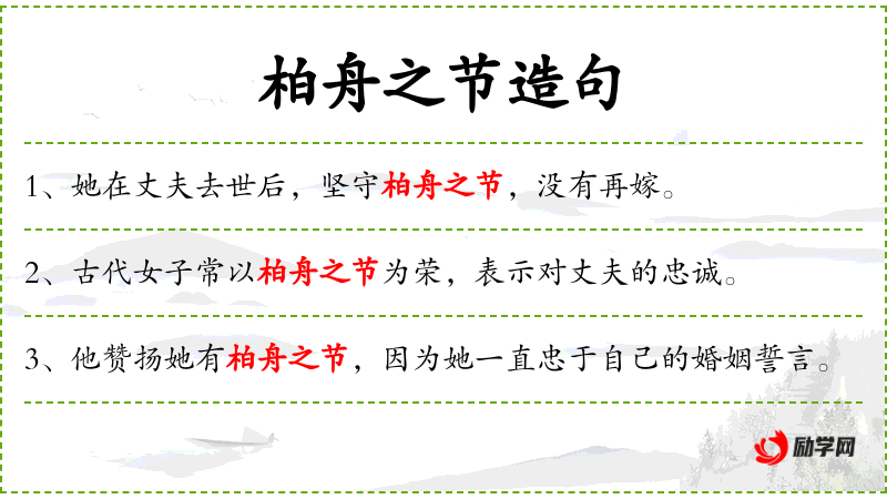 4. 【柏舟之节】 - 指妇女丧夫后守节不嫁。同“柏舟之誓”。