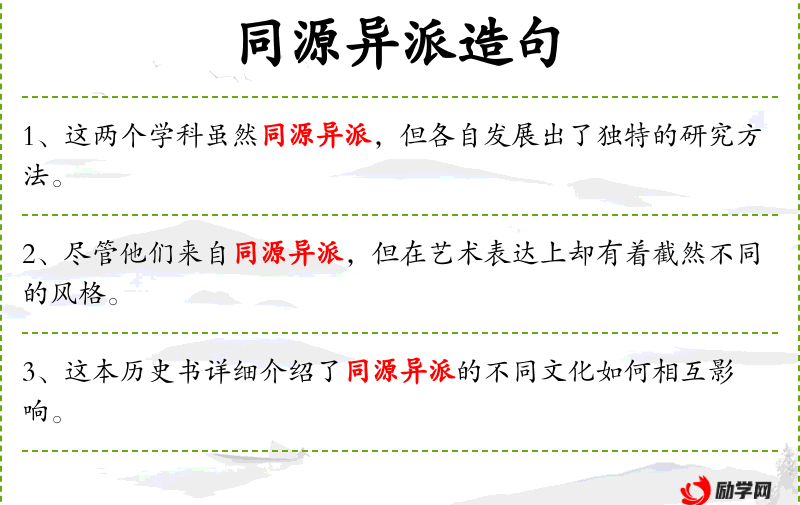 - 同源异派:指两种语言有共同的源头,但在发展过程中分道扬镳。