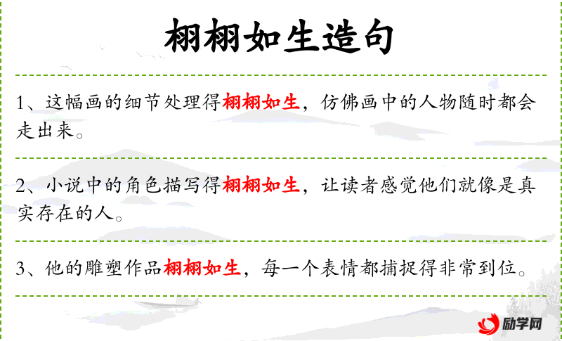 4. 【栩栩如生】 栩栩:活泼生动的样子。指艺术形象非常逼真,如同活的一样。
