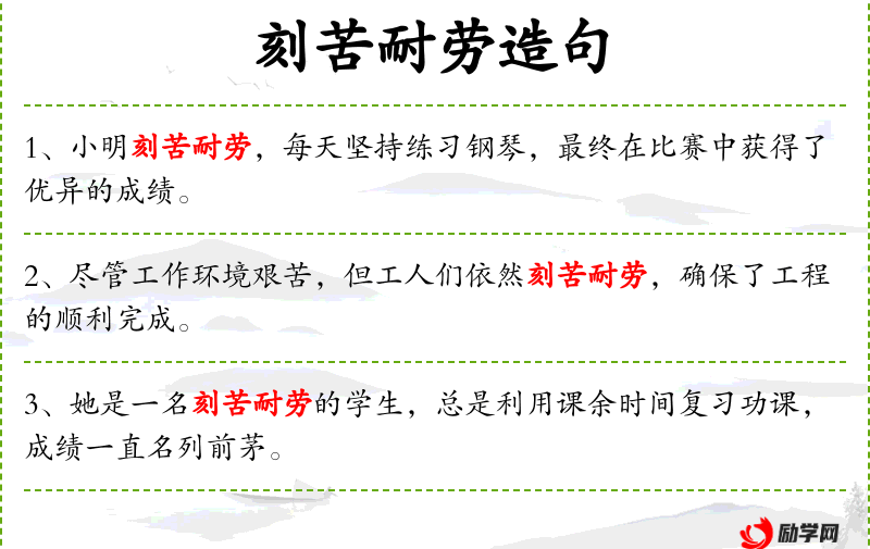 - 刻苦耐劳:形容词短语,表示勤奋努力,不怕困难。