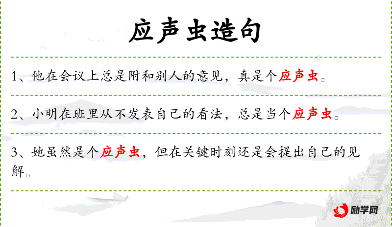 - 应声虫:这个成语在**文化中常用来批评那些没有主见、盲目附和他人的人。