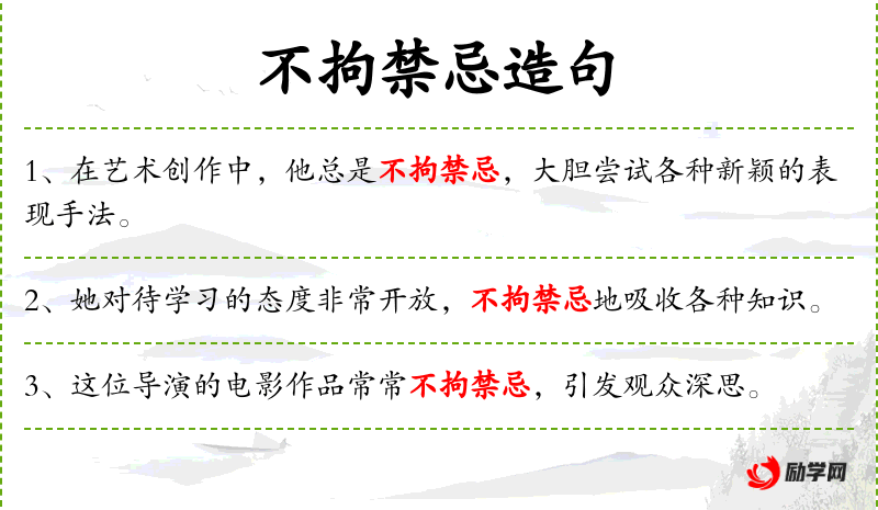 - 状语:不拘禁忌地提出改进建议