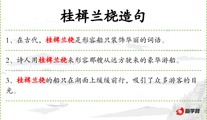 3. 【桂楫兰桡】 - 楫、桡:都是用来划船的浆。形容船上用品精美名贵。