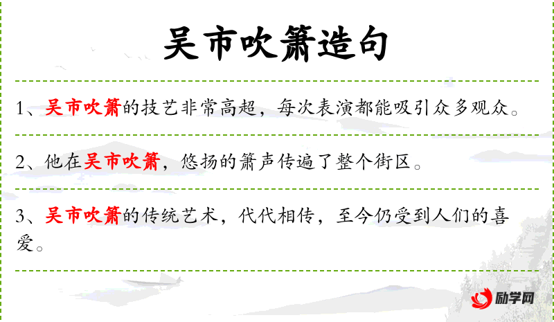 - 英文:He played the xiao in Wu City, and the melodious sound of the xiao spread throughout the entire neighborhood.