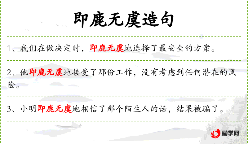 - 成语:即鹿无虞,源自《左传·僖公二十四年》,比喻做事时没有顾虑。