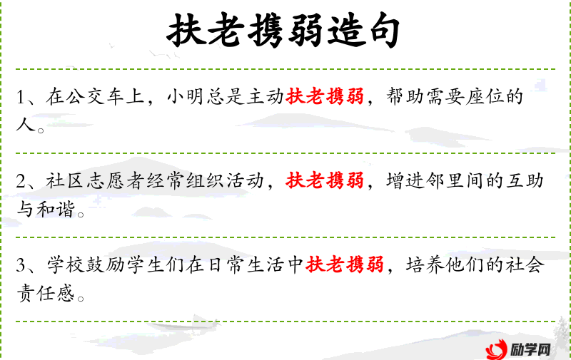 - 相关成语:“扶老携幼”是一个相关的成语,意指帮助老人和小孩。