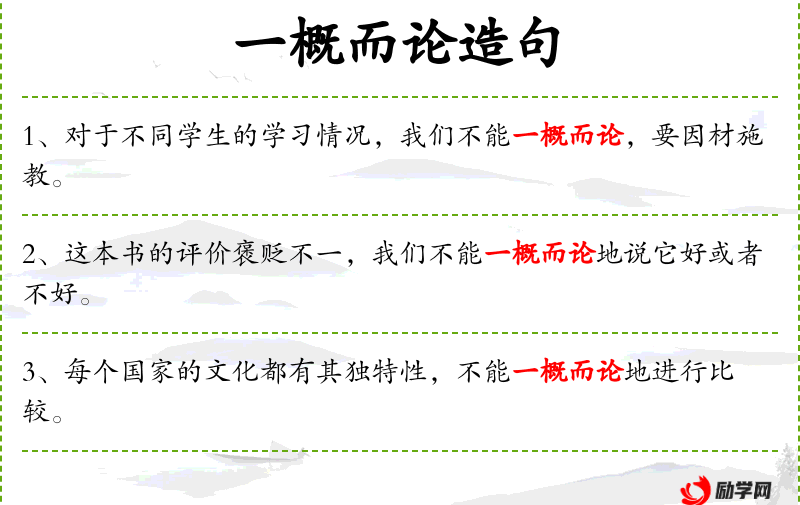 1. 【一概而论】 - 一概:同一标准,一律。指处理事情或问题不分性质,不加区别,用同一标准来对待或处理。