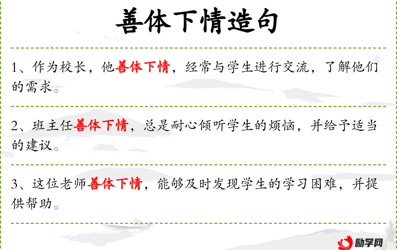 1. 【善体下情】 体:体贴;下:下属。善于体察下属的冷暖。形容关心下级。