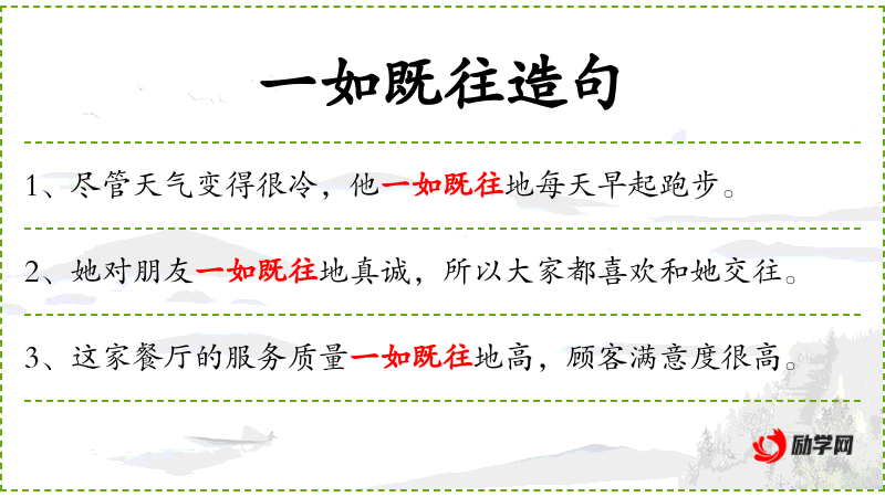 1. 【一如既往】 一:完全;既往:从前,已往。指态度没有变化,完全象从前一样。