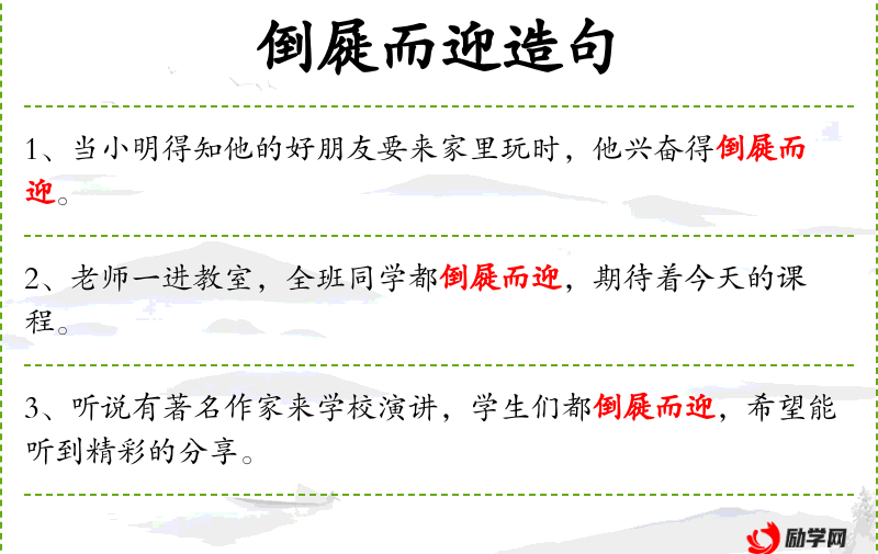 - 倒屣而迎:比喻热情迎接客人,源自《史记·孟尝君列传》。